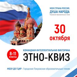 6) Командная интеллектуальная викторина «ЭТНО-КВИЗ» для учащихся 8-11 классов проводится очно 30 октября 2023 г. В викторине «Этно-квиз» могут принять участие команды учащихся 8-11 классов образовательных организаций города. Заявки на участие подаются до 20 октября 2023 г. Приглашение на викторину, в котором указано точное время и место проведения, будет выслано после обработки заявок электронным письмом на официальный адрес организации.