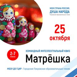 5) Командный интеллектуальный квиз «Матрёшка» о культуре, традициях, обычаях и фольклоре народов России проводится очно 25 октября 2023 г. для возрастных групп 2-4 классы, 5-7 классы. В квизе «Матрёшка» могут принять участие команды учащихся 2-4 классов и/или 5-7 классов образовательных организаций города. Заявки на участие подаются до 16 октября 2023 г. Квиз проводится очно 25 октября 2023 г. отдельно для каждой возрастной группы – 2-4 класс или 5-7 класс. Приглашение на мероприятие, в котором указано точное время и место проведения, будет выслано после обработки заявок электронным письмом на официальный адрес организации.