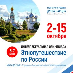 2) Интеллектуальная олимпиада «Этнопутешествие по России» для учащихся 5-7 классов проводится 02-15 октября 2023 г. дистанционно на сайте МБОУ ДО ГЦИР. Чтобы стать участником олимпиады, обучающемуся необходимо быть зарегистрированным на сайте МБОУ ДО ГЦИР на программу программу «Художественные традиции России» (5-7 класс). Олимпиаду составляют 80 вопросов . Задания олимпиады выполняются участником последовательно путём выбора правильного ответа из предложенных четырех. На выполнение олимпиады отводится 40 минут. Участнику дается одна попытка.