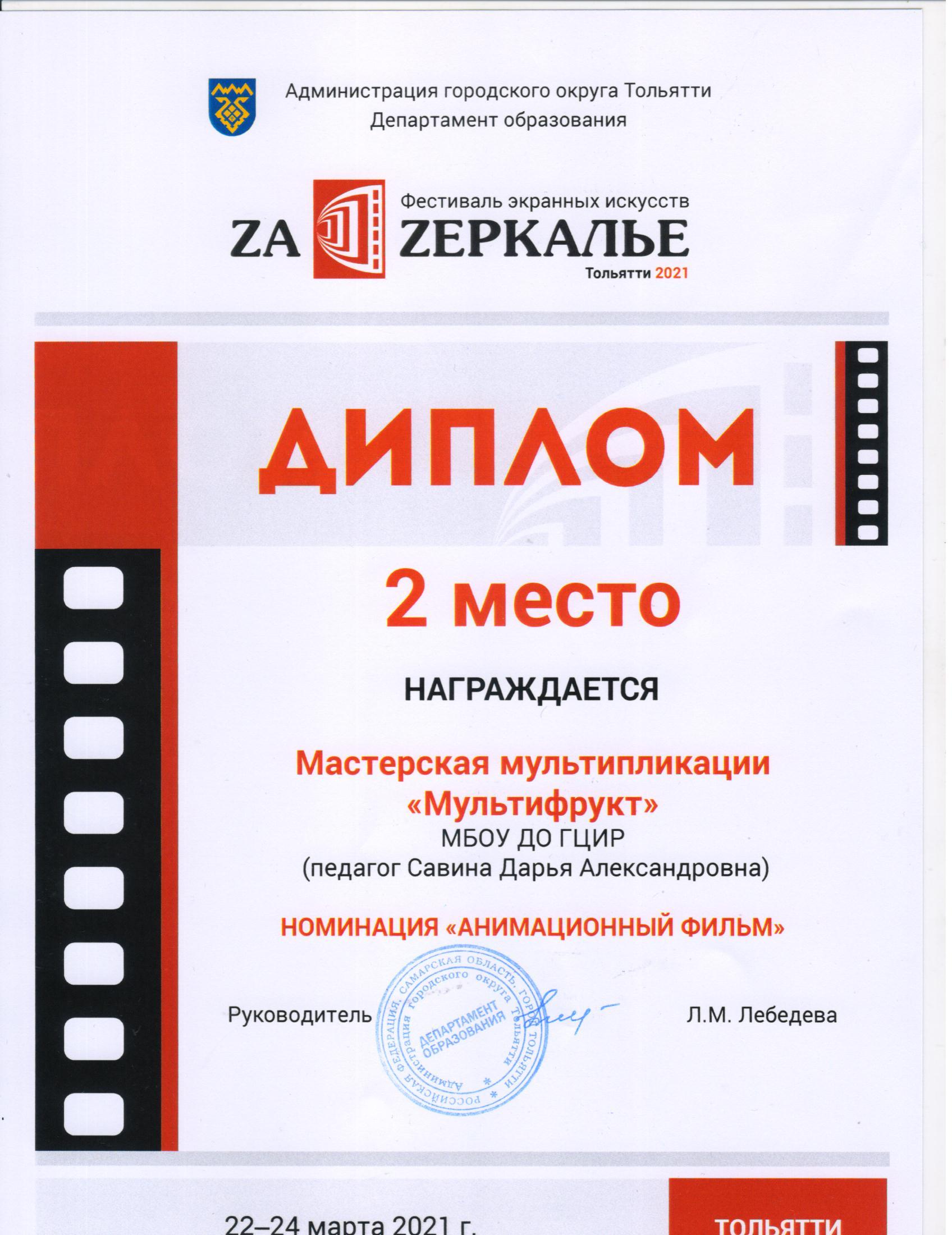 Городской фестиваль экранных искусств "Зазеркалье": диплом 2 место в номинации "Анимационный фильм"; Презентация на учрежденческом Фестивале интеллекта и творчества «Мы в Центре» |