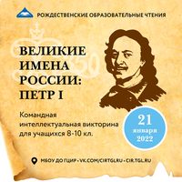 Командная интеллектуальная викторина «Великие имена России: Петр I» проводится очно для учащихся 8-11 классов 21 января 2022 г.